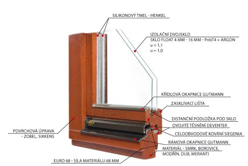 Profily hranolů na výrobu Eurooken jsou slepeny a lisovány z lamel, čímž je zaručena tvarová rozměrová stabilita bez ohledu na rozdíl teplot mezi vnějškem a vnitřkem objektu. Ve standardu vyrábíme okna z borovice nebo smrku.