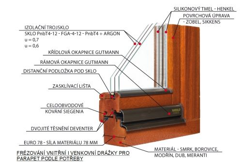 - nový moderní tvar firmy Gutmann rámové a křídlové okapnice z eloxovaného hliníku v kombinaci s plastem. Zamezuje vzniku tepelného mostu ve spodní části okna a zabraňuje vzniku kondenzátu uvnitř dřevěného profilu v návaznosti na okolní okrajové podmínky a podmínky stavby.